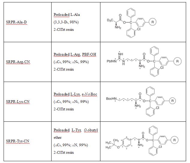 通過(guò)與新英格蘭肽公司(NEP)的合作,CIL可以提供合成預(yù)載樹(shù)脂,以幫助固相合成穩(wěn)定同位素標(biāo)記的胰蛋白酶肽。這些2-氯三酰(2-ClTrt)樹(shù)脂最初由Barlos及同事發(fā)現(xiàn)的,非常適合合成同位素標(biāo)記的胰蛋白酶肽,用作穩(wěn)定同位素稀釋質(zhì)譜(SIDMS)分析中的定量標(biāo)準(zhǔn)。這些樹(shù)脂是由具有最高化學(xué)、同位素和手性純度的標(biāo)記的、受保護(hù)的氨基酸制備的。此外,由于2-ClTrt樹(shù)脂在負(fù)載過(guò)程中不發(fā)生對(duì)映體化,因此,2個(gè)含有同位素標(biāo)記殘基的肽基本上不受非對(duì)映體副產(chǎn)物的污染。