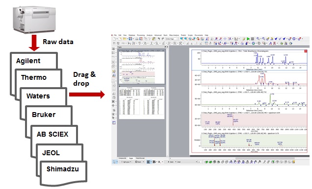 可以打開來自不同儀器(Agilent、Bruker、JEOL、Thermo、Waters)以及mzData或mzXML格式的數(shù)據(jù);自動或手動對TIC、MS、UV/ELSD進行峰積分;根據(jù)TIC峰、是否扣除背景選擇質(zhì)譜,并以centroid或profile模式顯示;可以手動添加質(zhì)譜,也可以在同一文檔中打開NMR和MS數(shù)據(jù),并同時對其進行分析報告。