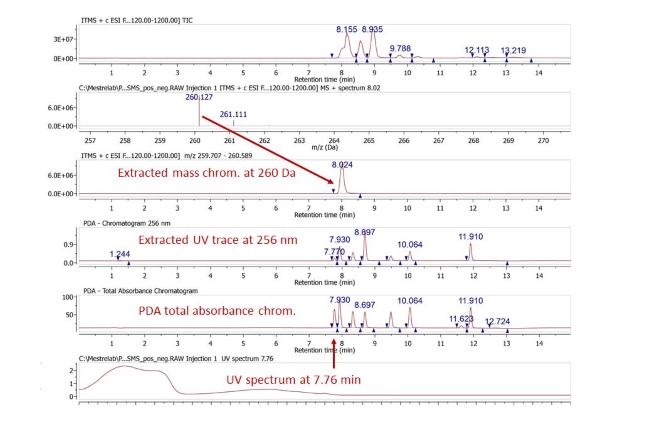 生成給定質(zhì)量范圍或特定m/z值的提取質(zhì)量/離子色譜圖(EMC/EIC);也可以從DAD trace生成給定波長的UV trace;從PDA總吸光度色譜圖中提取選定保留時間的紫外光譜。