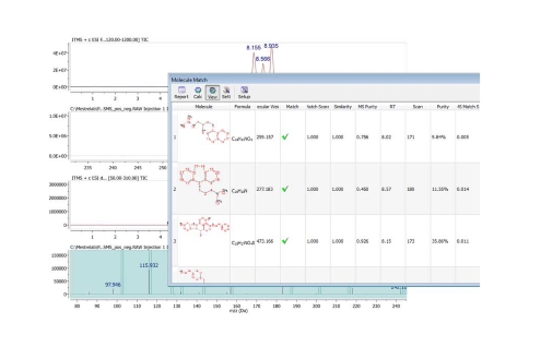 輸入化學結(jié)構(gòu),由軟件確認哪些與實驗數(shù)據(jù)相匹配,匹配標準可以通過選擇加合物和損失、質(zhì)量準確度和評分閾值等來確定。