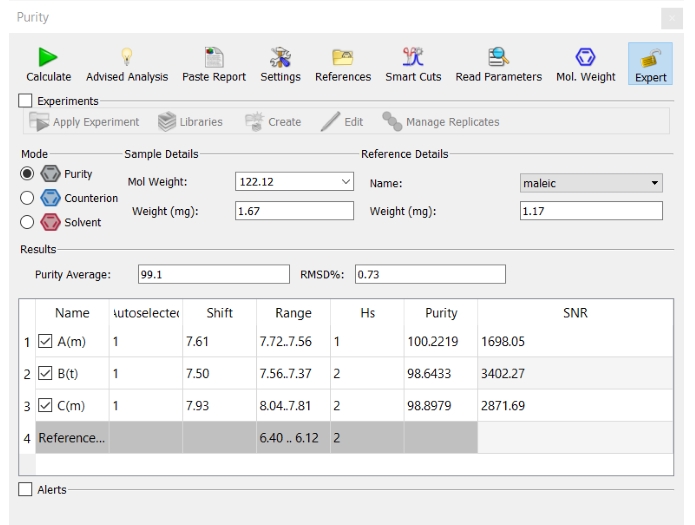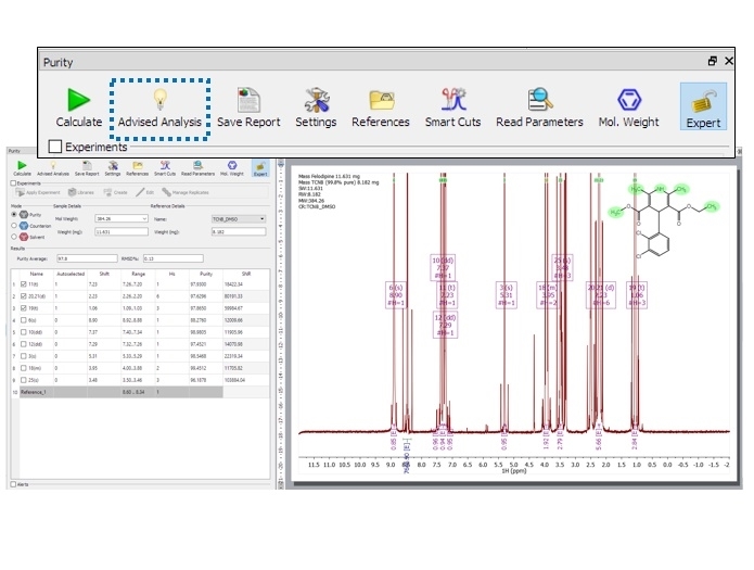 點(diǎn)擊一下“Advised Analysis”按鈕即可獲得純度結(jié)果。此功能將首先找到您的參數(shù)(分子量、樣品重量、參考化合物等),然后應(yīng)用優(yōu)化設(shè)置進(jìn)行NMR分析,最后計(jì)算化合物的純度。